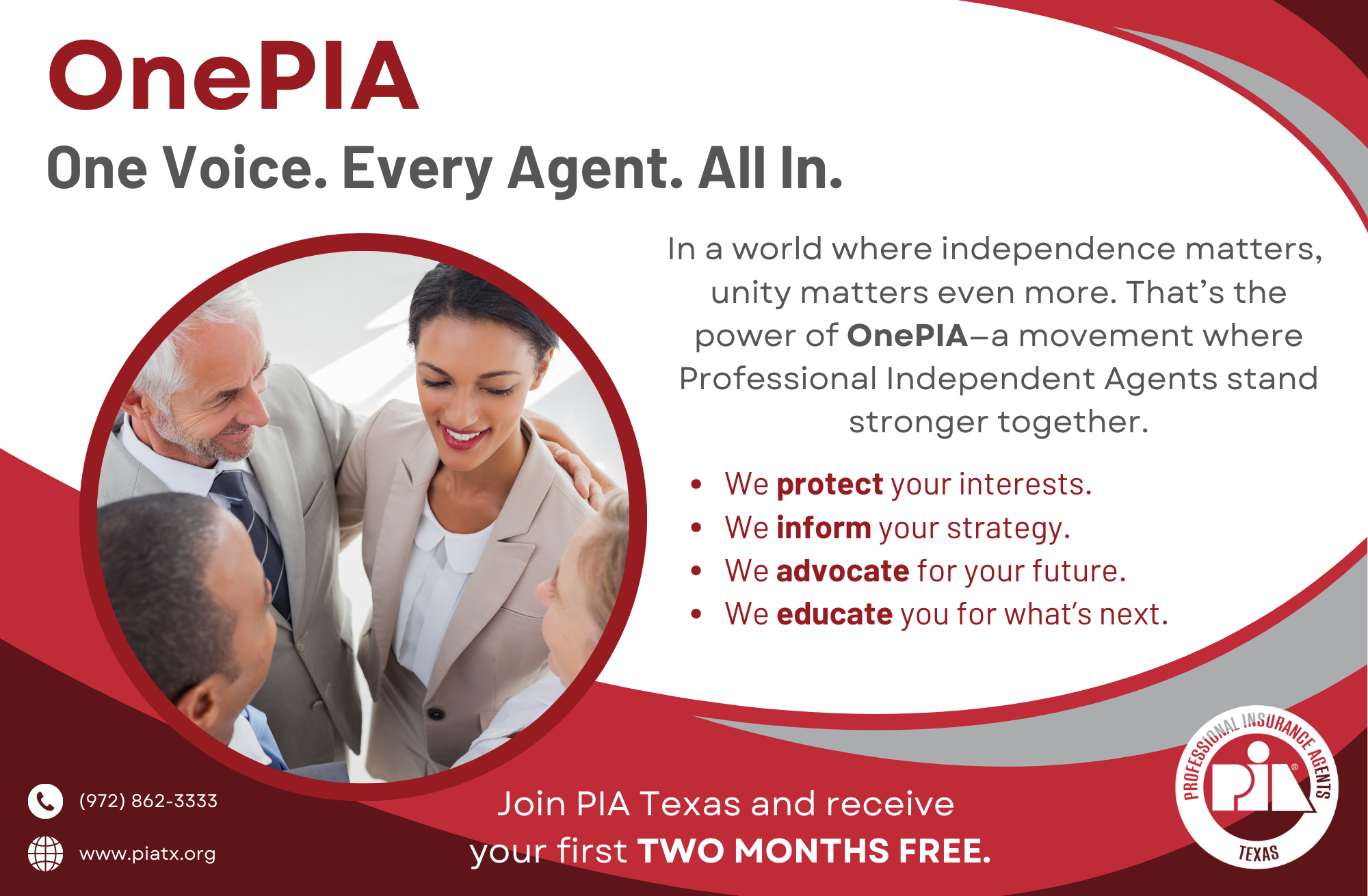| Unlock the power of connection, knowledge, and growth with PIA Texas membership. As an independent insurance professional, you deserve more than just resources—you deserve a partner committed to your success. PIA Texas gives you exclusive access to advocacy that protects your business, education that sharpens your edge, and tools that help your agency thrive in a competitive market.And here’s the best part: new members receive TWO MONTHS FREE. That’s 60 days of connection, resources, and advocacy—completely on us. And we have a flexible payment plan that starts as low as $35 per month.